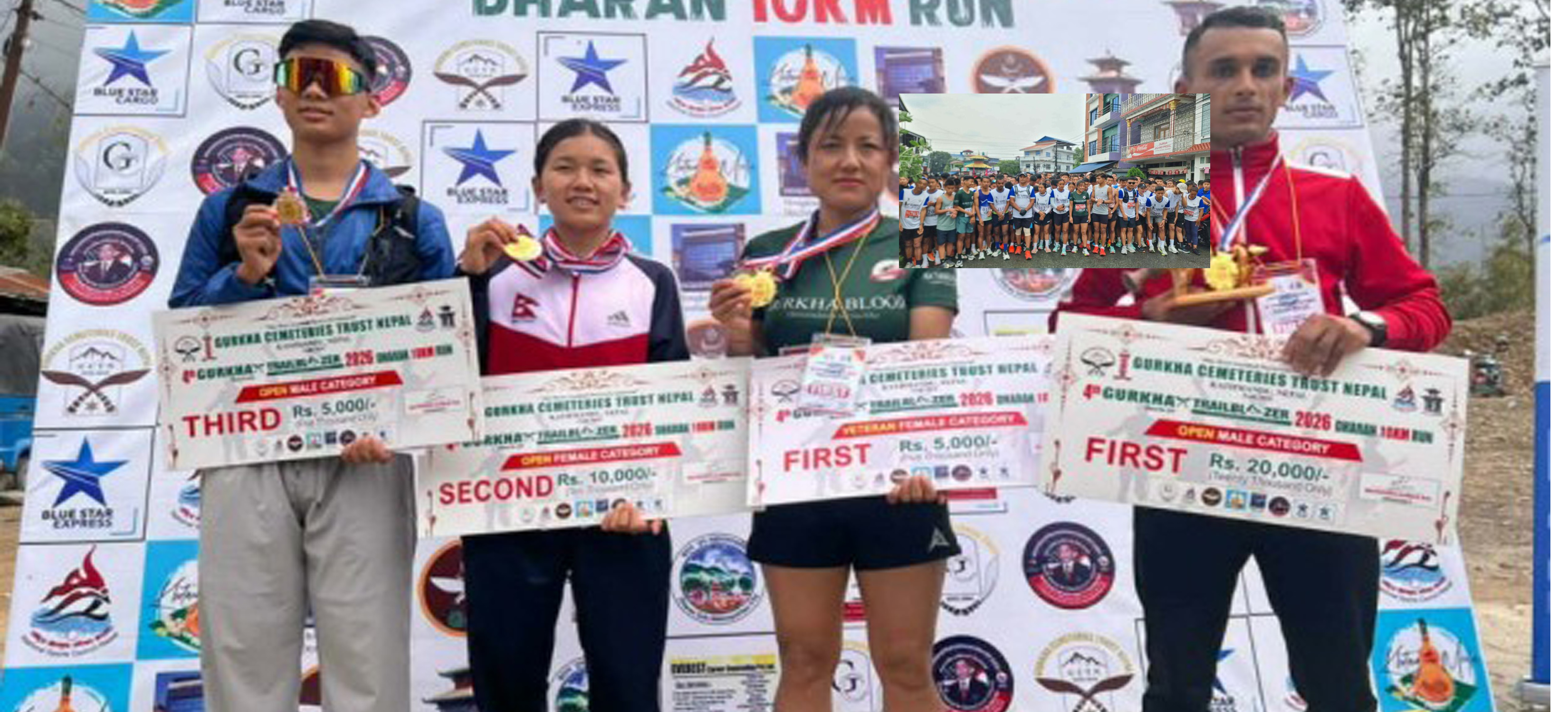 छाल खवरधरान,१४चैतः धरानमा आयोजित चौथो संस्करणको गोर्खा ट्रेल ब्लेजर दौड प्रतियोगिता २०८२ सम्पन्न भएको छ । गोर्खा सिमेट्रीज ट्रष्ट नेपालको आयोजनामा शनिवार धरानमा प्रतियोगिता सम्पन्न भएको हो । गोर्खा ...